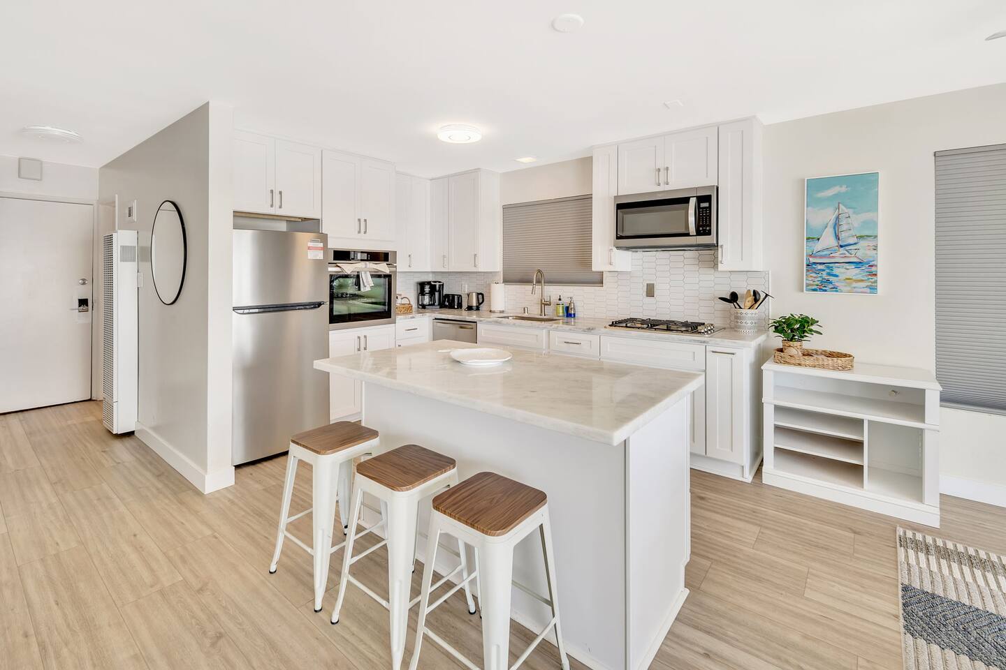 •Open floor plan that provides you with beautiful views of the ocean. •Freshly made king or sofa bed to relax the day away. •Plenty of closet space to store your items and hang up that new swimsuit you've been dying to try out! •Modern flat-screen TV and brand new comfortable seating arrangements. •Private balcony with seating for 2, perfect for taking in the sunset. •Dining table ready to seat 4. •Well-appointed kitchen with stainless steel appliances and island seating for 3. Need a place to do laundry? Not a problem! Outside your door and on the right is a wonderful LG Washtower, ready to get your clothes fresh for a night in the city!