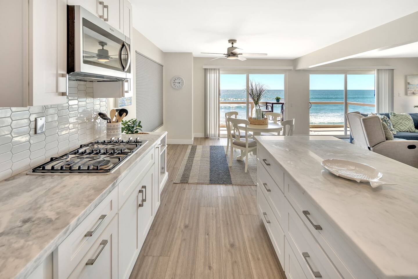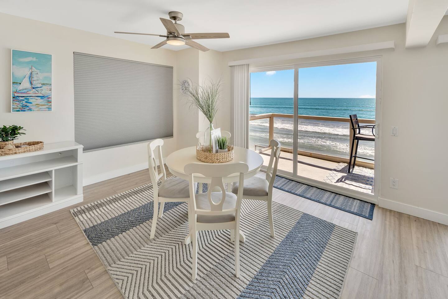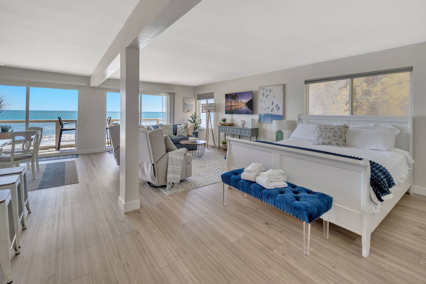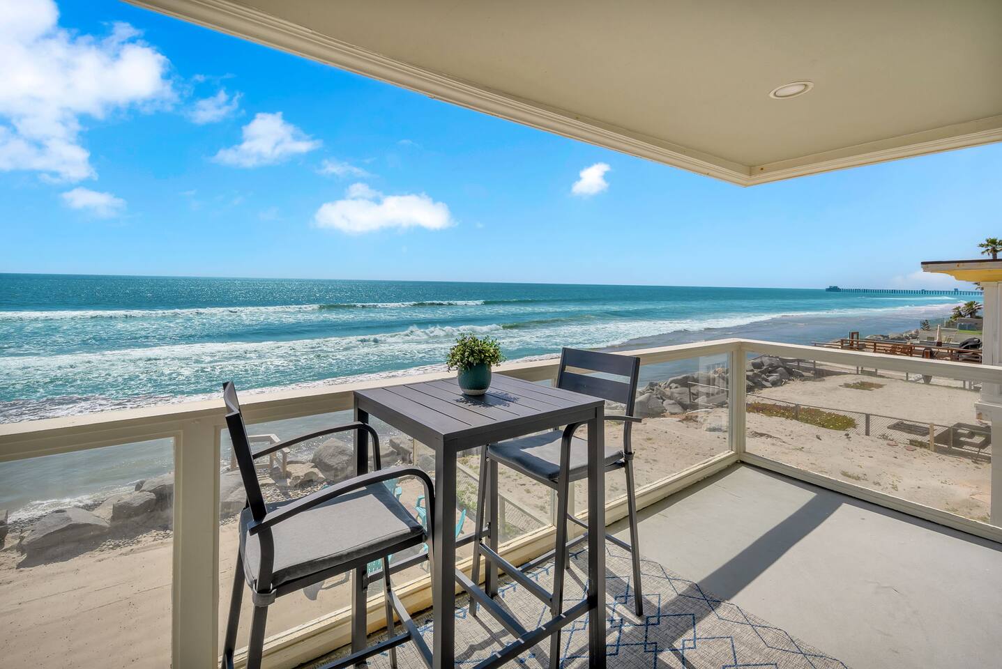 Enjoy breathtaking ocean views and a serene atmosphere that is perfect for a relaxing getaway. •Direct access to the beach. •Private patio overlooking the ocean. •Well-appointed and comfortable living area. •Fully equipped modern kitchen. •King sized bed and full size pull out couch. •Close to downtown Oceanside. More than 4 guests? Ask us about our 2 bedroom unit!